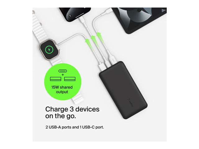 - Charge up to three devices at the same time with its USB-C port and dual USB-A ports