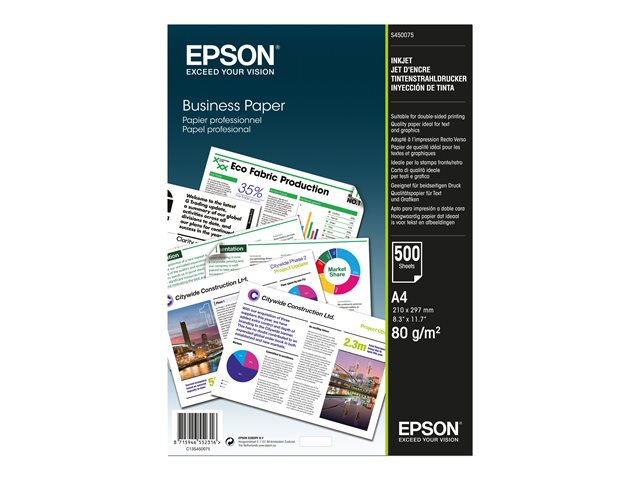 Produktbeskrivelse Epson Business Paper - vanlig papir - 500 ark - A4 - 80 g/m² Produkttype Vanlig papir Mediestørrelse A4 (210 x 297 mm) Utskriftsteknologi Ink-jet Medievekt 80 g/m² Inkludert antall 500 ark Kompatibel med Epson L382, L386, L486; EcoTank ET-16500, 2600, 2650, 2750, 2751, 2756, 2850, 2851, 2856, 3750, 4750, 4850, 7700, 7750, L14150, L1455, L15150, L6460, L6490, M3170; Expression Home XP-342, 442; Expression Photo XP-970; Expression Premium XP-540, 900; WorkForce Pro RIPS WF-C879, WF-8090, C5790, C869 -