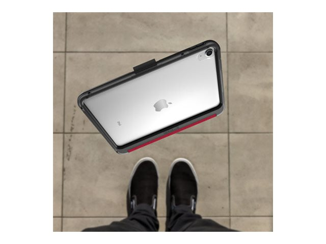 Symmetry Series Folio clear folio case protects your tablet against drops, and its clear back makes it easy to identify engravings and asset tags. The microfiber folio lining guards the screen an elastic band holds it closed. The folio quickly converts into two positions for typing and viewing. Plus, the case stays put on slick surfaces thanks to no-skid rubber feet.